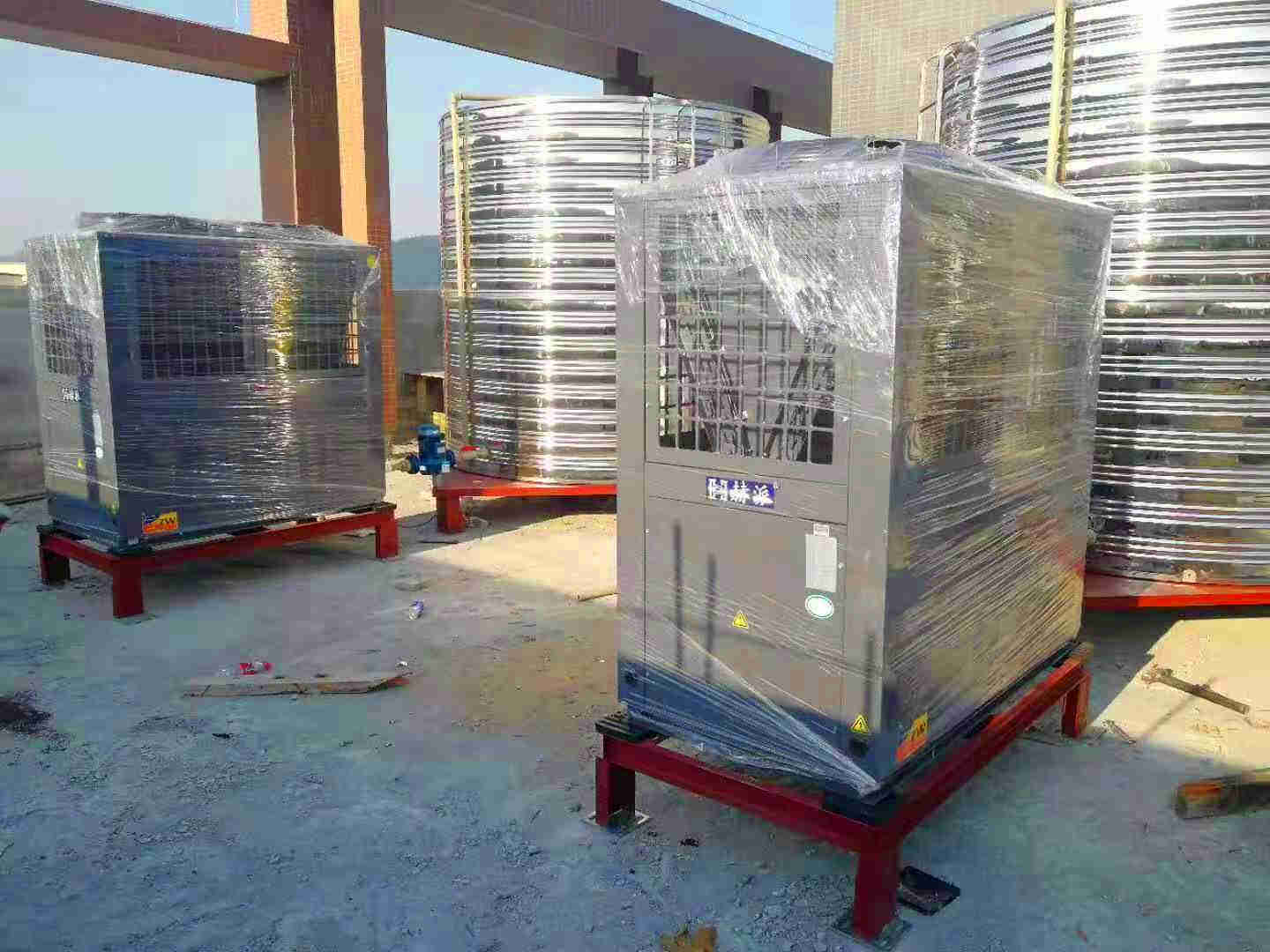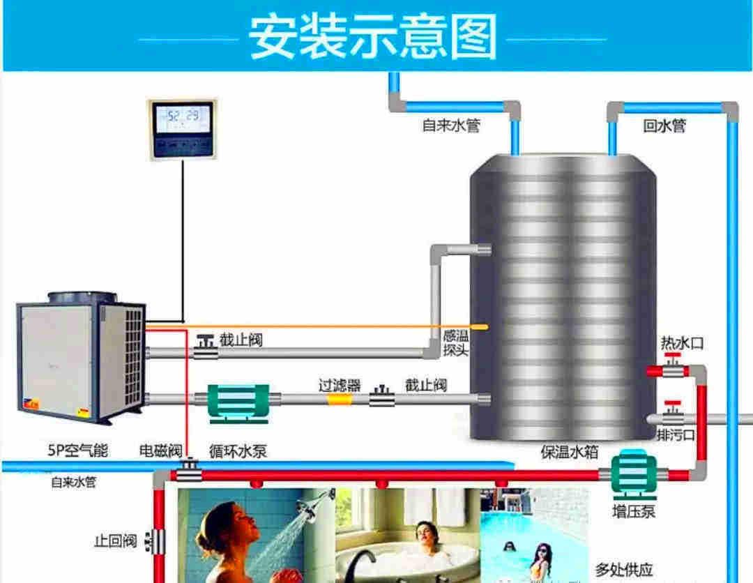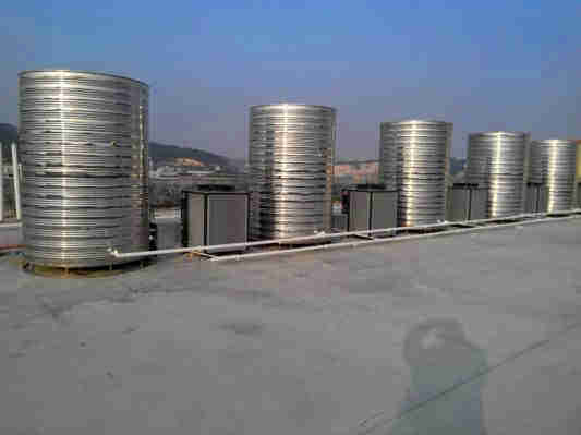 在標況下系統(tǒng)設計為自來水流經(jīng)機組一次升溫5℃。將保溫水箱中的水循環(huán)加熱至設定溫度。系統(tǒng)設計簡單,在天氣比較寒冷區(qū)域,機組能穩(wěn)定運行。